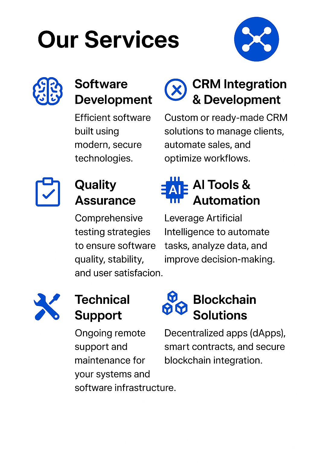 The IT services company established to serve international clients with transparency, efficiency, and full legal compliance. Our team delivers tailored technology solutions across UAE and over the world with a strong focus on reliability, security, and clear communication.